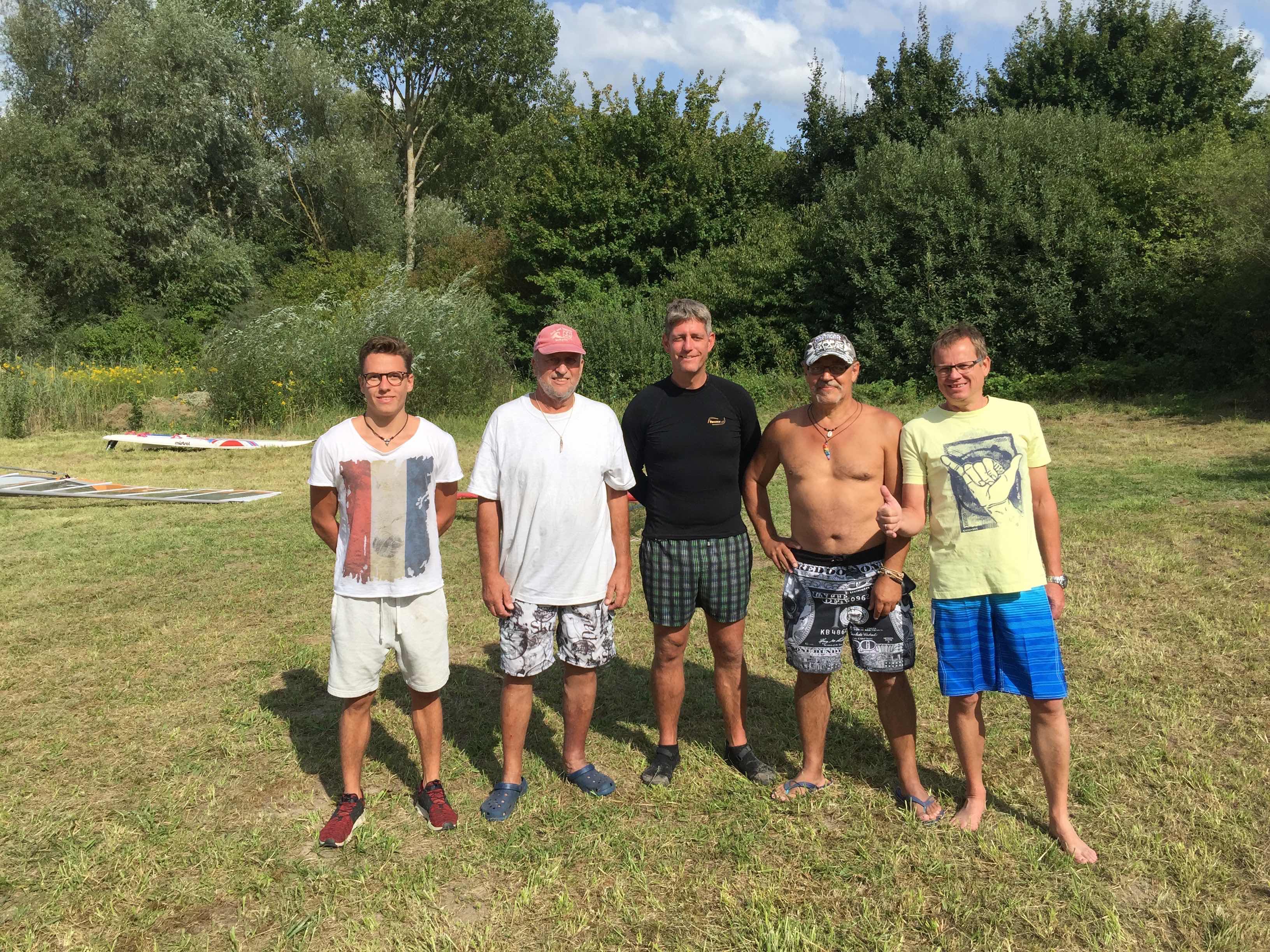 Mit dem vollgepackten Anhänger von Gerald und dem Transporter von Jürgen, rückten wir in Rheinzabern an. Nach dem Entladen bauten sie die Riggs fachmännisch auf und begutachteten den Stand der Segel aufs Neue. Hier ein Dank für den vollen Einsatz an unser Mannschaftsteam.