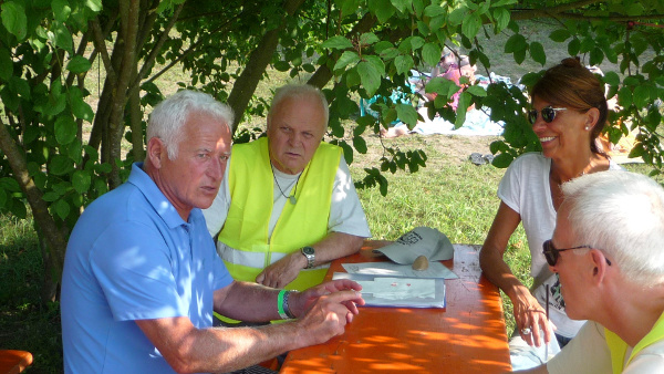 Am Sonntag, ab 10.30 Uhr wurde der Verpflegungsstand eingerichtet und letzte Vorbereitungsarbeiten der Präsentation mit dem Simulator und der Video- Show  vorgenommen. Gegen 12.00 Uhr standen alle Helfer „ Gewehr bei Fuß“ jedoch weit und breit zeigte sich kein Besucher. Verflixt, wo bleiben denn die Familien, Rentner, Jugendlichen, es wurden doch 1000 Gäste erwartet! Und dann stand auch noch die „ blöde“  Hüpfburg für die ganz Kleinen im Blickfeld. Die ersten Chöre präsentierten auf der Bühne ihr Gesangsrepertoire, aber kaum einer hörte richtig zu. Die ersten Stunden am Nachmittag verliefen sehr schleppend. Dabei hatten wir doch alles bestens vorbereitet, das Wetter war traumhaft, aber keine Gäste in Sicht. Die ersten Zweifel kamen auf: ist unser Angebot an Speisen und Getränken richtig ausgewählt, stimmt unser Gesamtkonzept, legen wir heute finanziell was drauf? Aber den anderen Vereinen  ging es auch nicht viel besser! Aber allmählich besserte sich die Situation, die ersten Gäste probierten unseren „Hugo Spezial“, die belegten Baguettes wurden gelobt, der Surfsimulator drehte  ständig seine Runden und unsere Jungsurfer zeigten ihre Künste auf dem Baggersee.