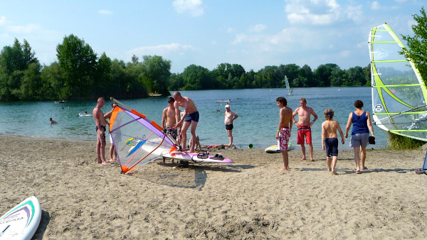 Auch in diesem Jahr nahm der SSJ wieder am Ferienfreizeitprogramm der Kulturgemeinde Jockgrim teil. An zwei Terminen in den Sommerferien fanden  19 Jungen und Mädchen den Weg an den Baggersee, wo die Boards mit den passenden Riggs schon vorbereitet für die praktischen Übungen bereit lagen. Doch bevor es aufs Wasser ging wurde von erfahrenen Surfern des Vereins zuerst die notwendige Theorie des Windsurfens vermittelt. Die seemännischen Begriffe wie z.B. Abfallen, Anluven, Halse und Wende usw. wurden bei Trockenübungen am Simulator geübt, denn sie sind Voraussetzung für erfolgreiche Manöver auf dem Wasser. In der Mittagszeit war die Stärkung mit Grillwürstchen und Getränken eine willkommene Unterbrechung, Aber dann hatte das ungeduldige Warten ein Ende, es ging endlich aufs Wasser! Erste Stehversuche auf dem wackligen Board unterstützten das Gleichgewichtsgefühl und jeder landete früher oder später mit Gejohle im Wasser. Zwischenzeitlich hatte der Wind etwas aufgefrischt und die Praxis mit Board und Rigg wurde fortgesetzt. Die Übungsleiter gaben Hinweise zum Handling und das  Erfolgserlebnis begann, wenn sich das Gefährt in Bewegung setzte. Sich vom Wind treiben lassen ist ein tolle Erfahrung, aber wie komme ich wieder zurück und wie war das nochmals mit den Vorfahrtsregeln? Letztlich wurden wieder alle eingefangen oder schafften es ohne Unterstützung und strahlende Gesichter waren der Beweis für eine erfolgreiche Veranstaltung, die am späten Nachmittag abgeschlossen wurde.