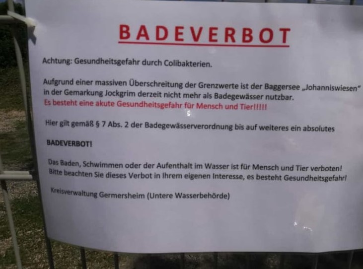 die Kreisverwaltung weist daraufhin, dass am Baggersee Johanniswiesen in Jockgrim eine Grenzwertüberschreitung an Colibakterien festgestellt wurde und damit das Baden im gesamten See verboten ist. Dies bedeutet, dass bis auf Weiteres auch das Surfen und SUP für uns untersagt ist. Entsprechende Warnschilder wurden auch am See aufgestellt. Bitte haltet Euch an diese Regelung.